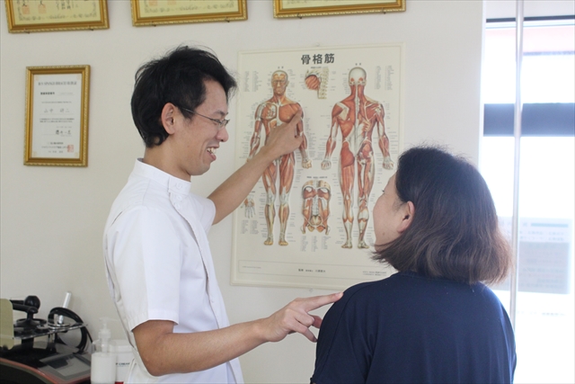 カウンセリング後、手技マッサージにより血行を促し、鍼又は灸により痛みの緩和をはかります。